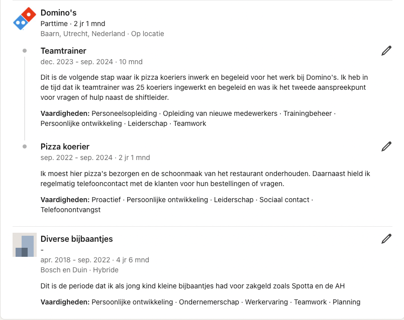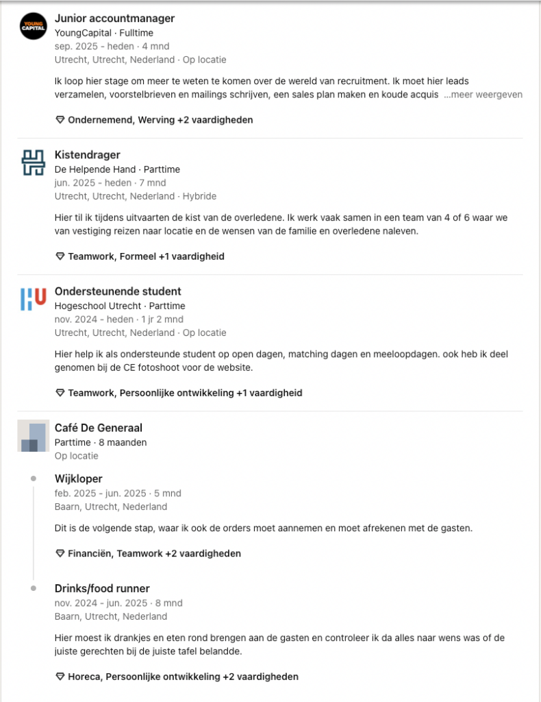 Naast mijn studie werk ik als kistendrager en als kinderbegeleider bij de Laurentiusgroep in Bilthoven. In deze rollen heb ik geleerd om verantwoordelijkheid te nemen, flexibel te zijn en goed om te gaan met verschillende mensen en situaties. Het begeleiden van kinderen vraagt om geduld, empathie en duidelijke communicatie vaardigheden die mij helpen om sterk in mijn schoenen te staan en effectief samen te werken.